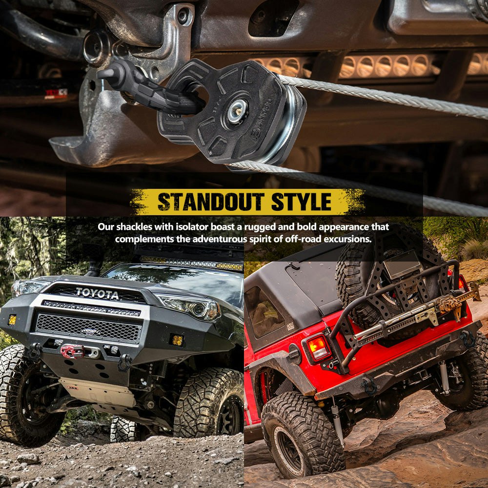 With robust working load limit of 4.75T, our tow shackles are built for tough off-road challenges, whether it's towing a 4x4 or truck out of deep mud, sand dune, or rocky trails. The isolators are crafted from soft, durable TPU, fully wrapping the shackles to reduce rattling noise and enhance vehicle protection. Our D ring shackles, made of drop forged steel, offer robust support for demanding recovery operations. Their premium powder coating ensures lasting protection against corrosion, preventing rust and deterioration over time. And this coating guards against fading, preserving the bow shackles’ appearance and visibility even under direct sunlight and exposure to outdoor elements. The robust 1.91cm screw pins offer enhanced safety with their secure locking mechanism, and facilitate straightforward attachment and detachment of the recovery shackles. The rugged style enhances your vehicle's aesthetics, ideal for adventurous excursions.