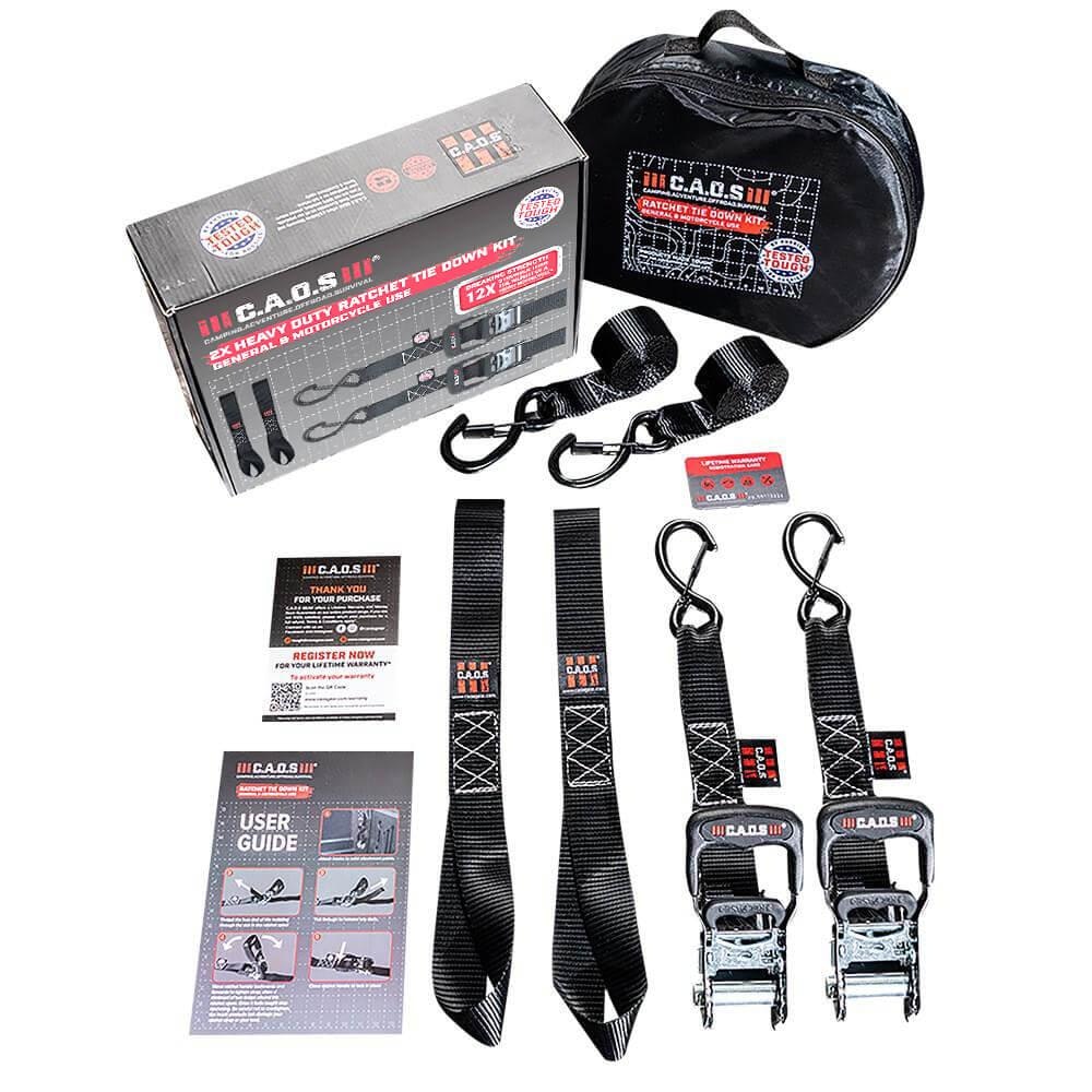 Ratchet Straps 2 pack with Bonus 2 Tie Down Soft Loops 2 Pack. CAOS Ratchet Straps tie-downs with S-hooks comes complete with bonus tie-down soft loops, to securely fasten a load while traveling or transporting. Made with sturdy, zinc-coated steel ratchets, Chromoly S-hooks and near indestructible polyblend webbing with heavy-duty stitching, these soft loop tie-down straps offer reliable performance and strength They are built to last and are a convenient way to secure items to your vehicle or in the back of your car. Worrying during road trips or while moving will be a thing of the past!