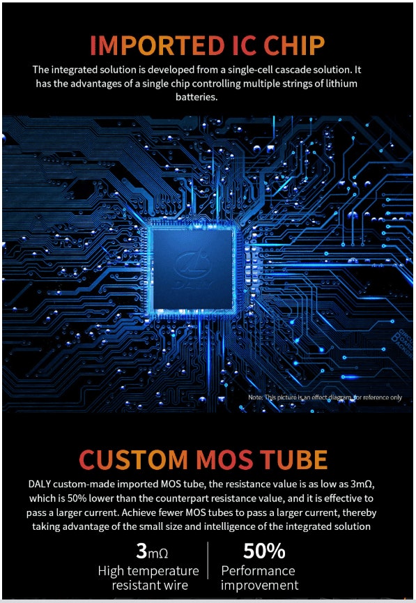 - Strong load ability, high constant discharge current, using high voltage tolerant and ultra low resistance power MOSFETs. Daly's extra large heat sinks and sealed thermal coating greatly assist cooling