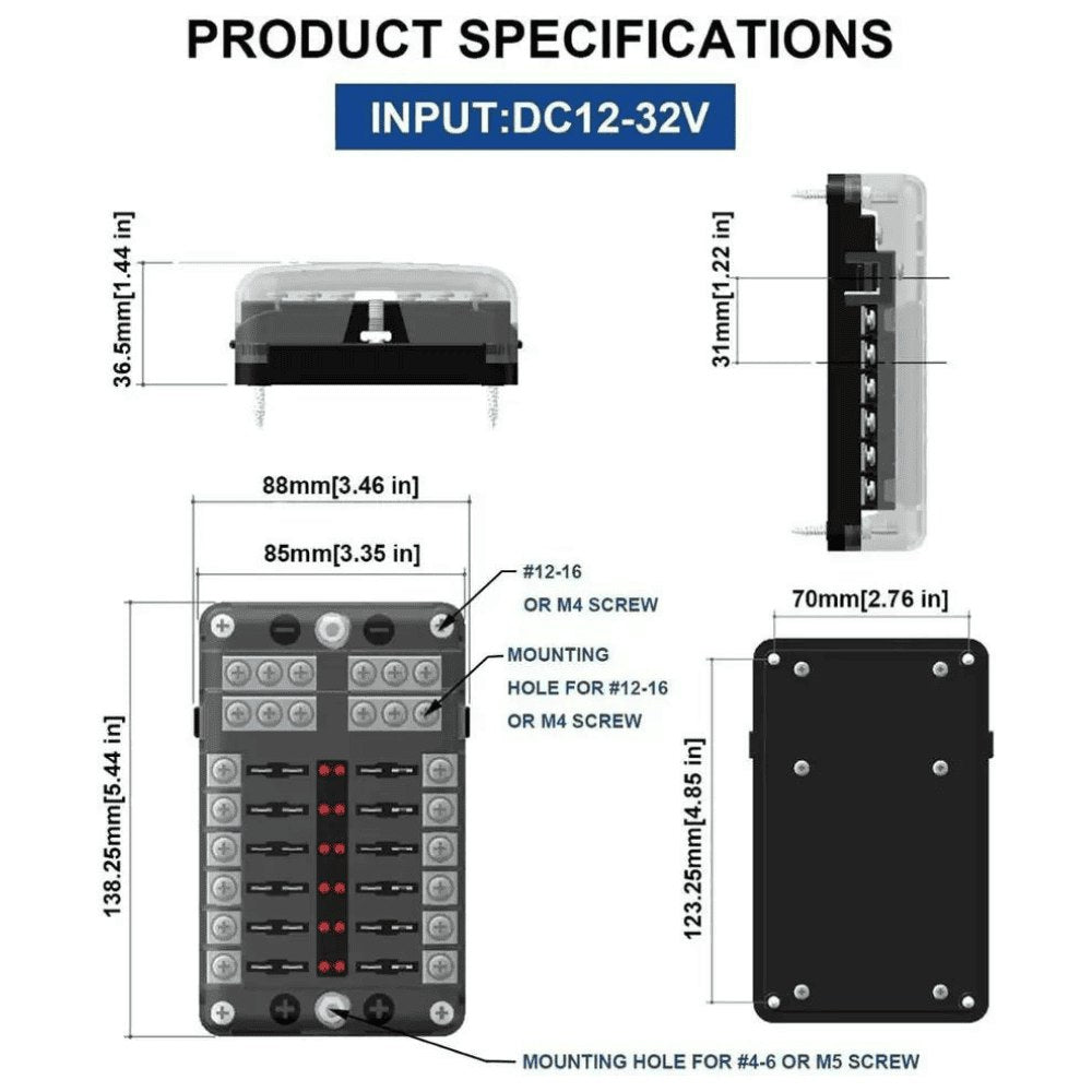 The dustproof design, complete with a clear, vibration resistant, snap-fit cover, ensures safe and convenient use. Each product package includes 2 label stickers, 3x 5A, 3x 10A, 3x 15A, 3x 20A fuses and 4 screws, simplifying the installation process.