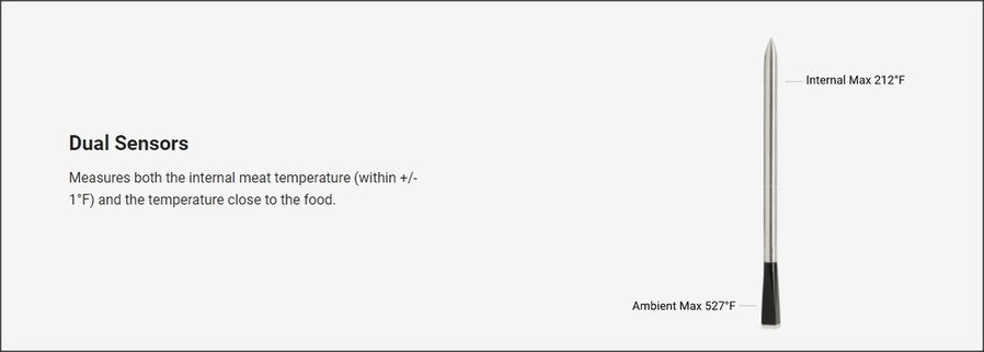 - 2 Sensors, 1 Probe: Dual temperature sensors in the probe can monitor internal meat temperature and ambient at the same time.