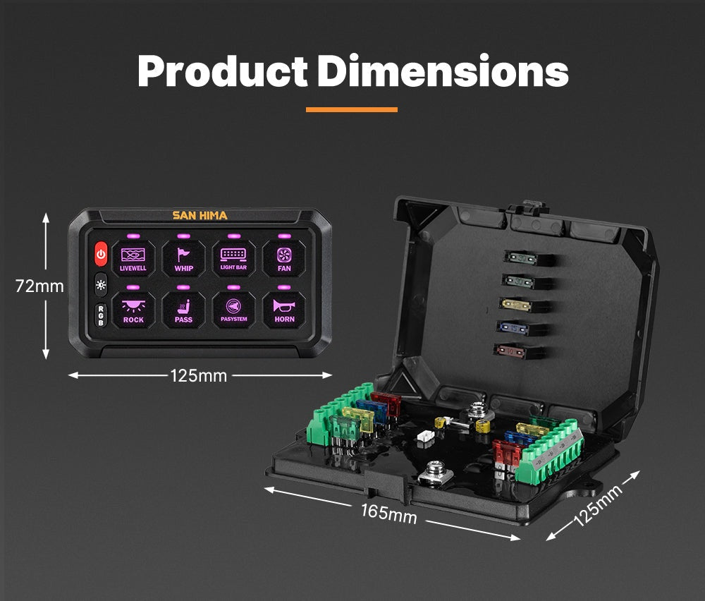 The SAN HIMA 8 Gang Switch Panel gives you full control over 8 circuits. Manage it effortlessly from your smartphone using the Bluetooth App. Equipped with 2x30A, 2x20A, 2x15A, and 2x10A fused switches, offering a maximum combined input of 60 Amps - the perfect solution for flexible and efficient management. The switch panel can be directly connected to the main or auxiliary battery, powering your devices reliably. And each circuit features a system failure indicator for quick connection confirmation. An 80 Amp circuit breaker, blade fuses, and high-power solid-state relays offer comprehensive electrical protection while the aluminium housing with an IP65 rating resists elements. It also comes with dual-sided outlets, essential hardware, and two bracket options for flexible wiring and easy installation. Plus, with a 5-level brightness adjustment, RGB color changing, and reusable labels, you can personalize your experience. Make your next adventure even more special with the panel.