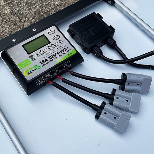 The kit includes 2 x 5m extension leads, & 2 x 500mm connector lead to alligator clamps for simple connection to power. The kit includes a 15Amp, 12V Dual Charging PWM solar charge controller – allowing the user to charge two 12V batteries simultaneously.
